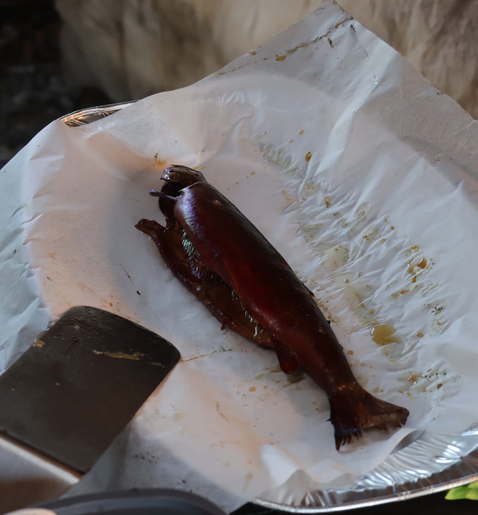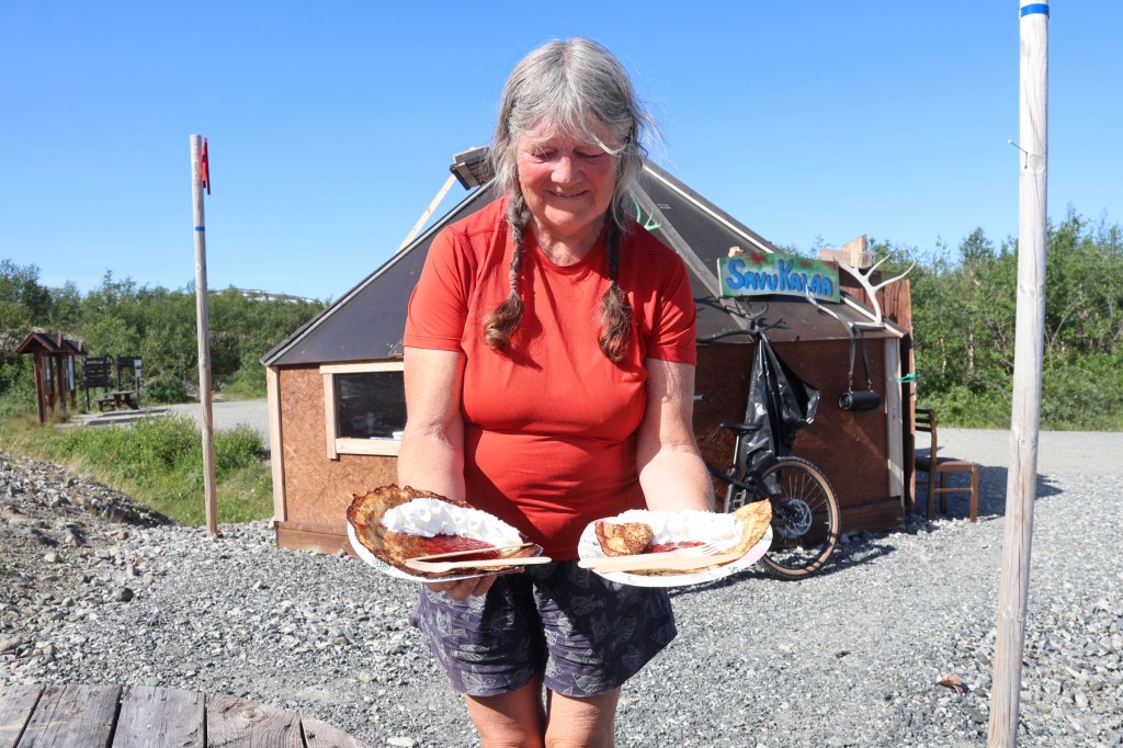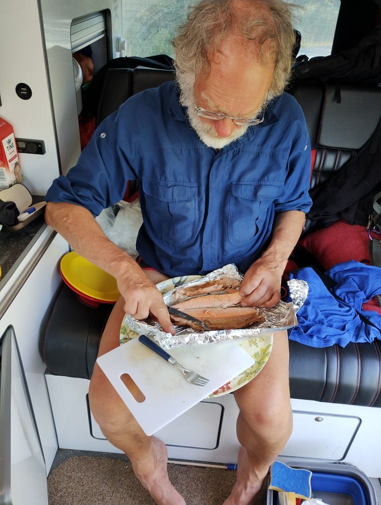 Back at the E8 (road) we came across an enterprising Finn selling the fish he had caught last winter and salted and dried, along with coffee and pancakes, so we had some of each.
