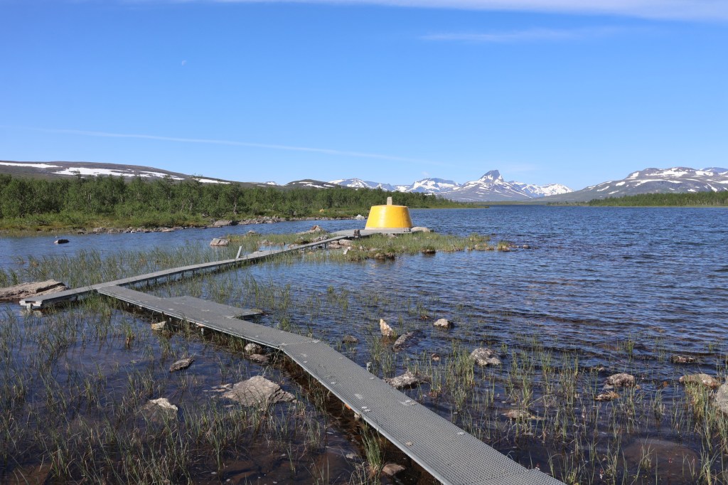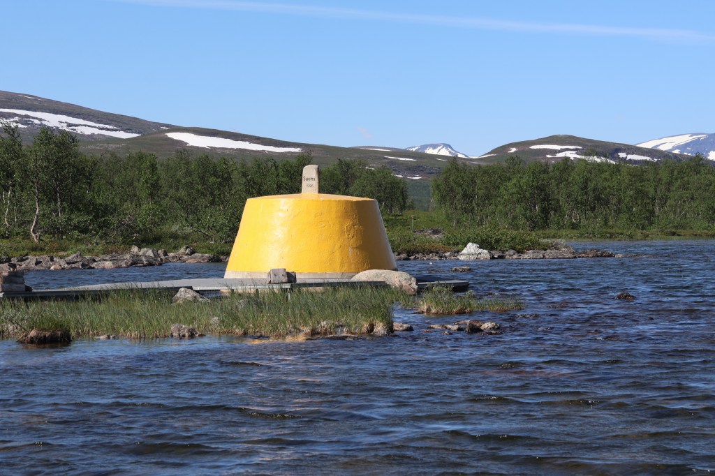 The meeting point is in a lake, accessed by a boardwalk to a shiny yellow cairn built recently by Norway.