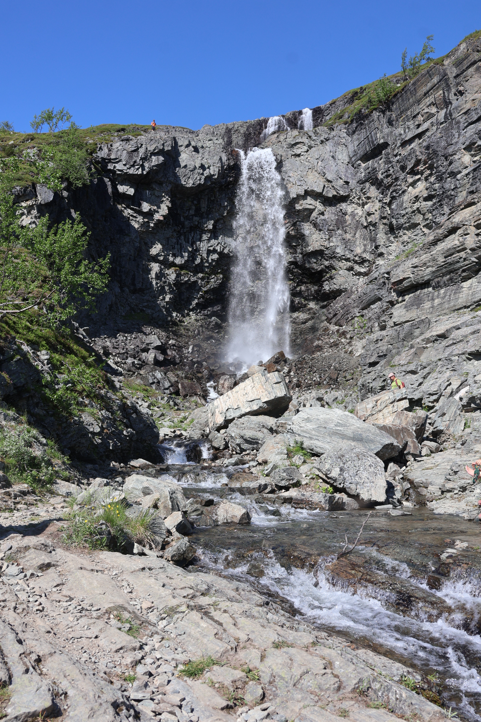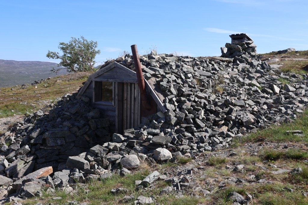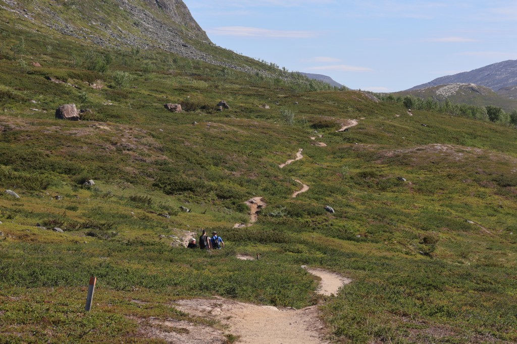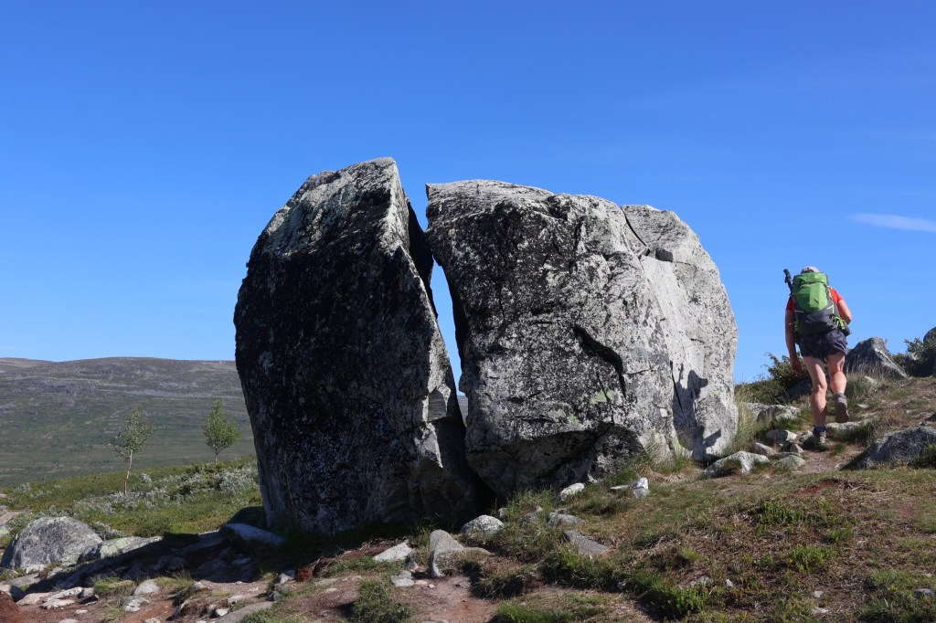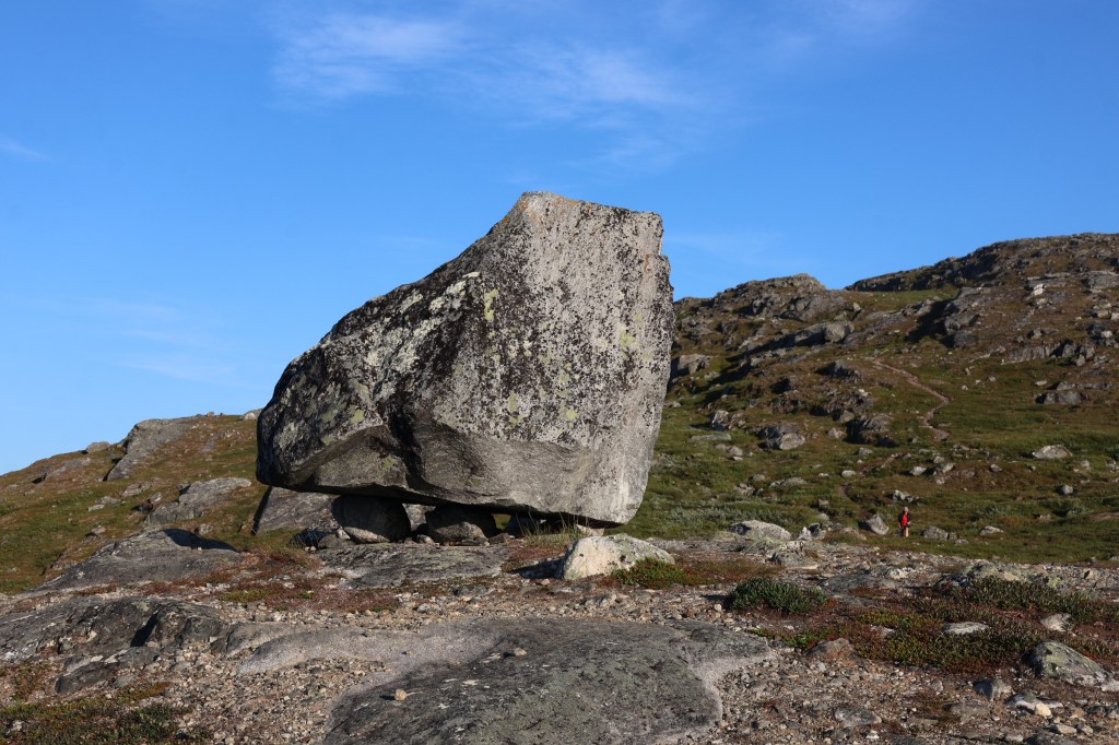 Our trail took us past Kitsiputous, Finnland’s highest waterfall. Round the side of the mountain Malla, we passed a rubble-covered World War 2 bunker and a remarkable split boulder. All the time we had views of Kilpisjarvi (lake) and Saana (fell) beyond. The last is important to Finns as an important waymarker on their travels. A very large eroded path is used to climb it.