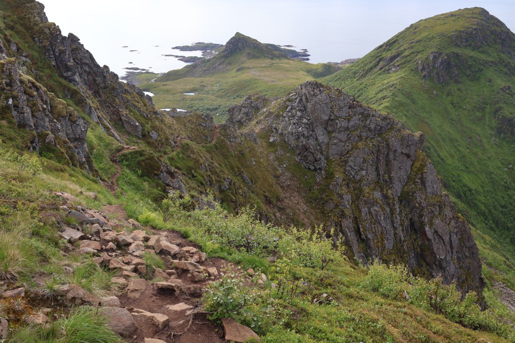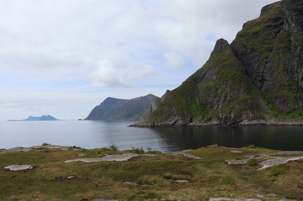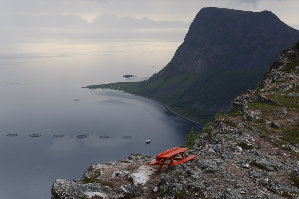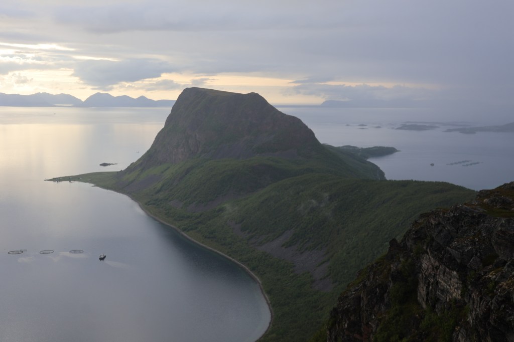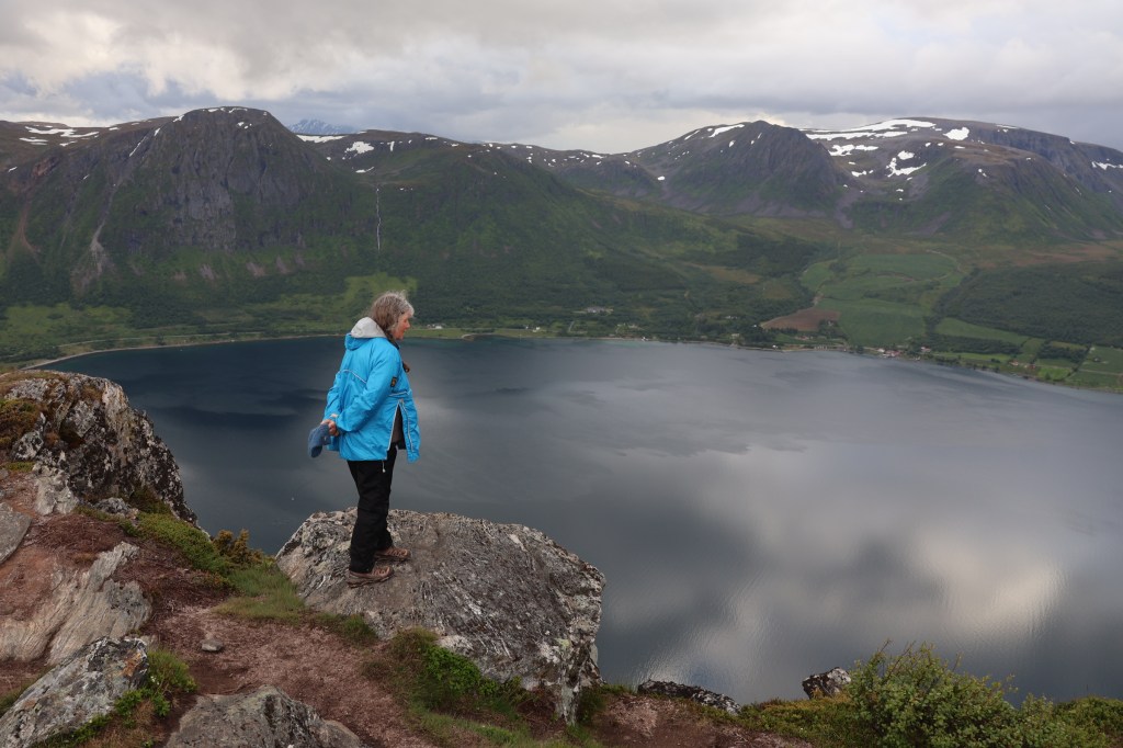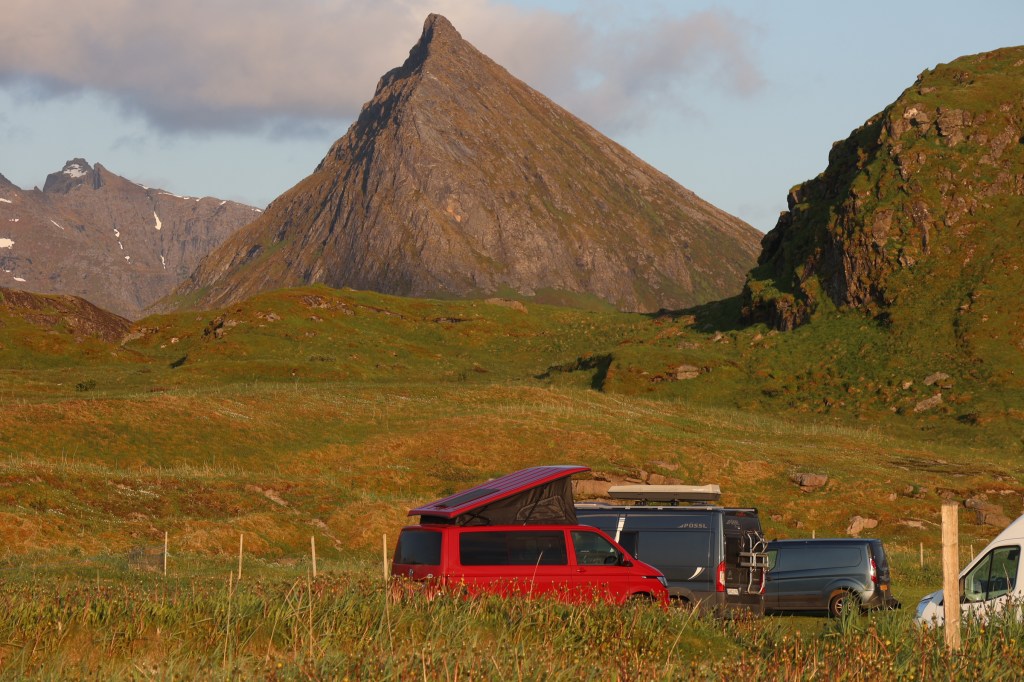 We headed for the town of Harstad then out to the end of the hill road at Elgsnes. At the high point of the road a car park offered an informal off-road overnight spot and an amazing evening walk to the peaks of Keipen, above great cliffs.