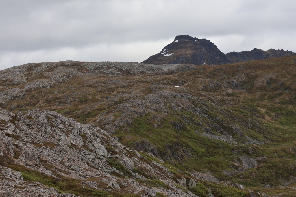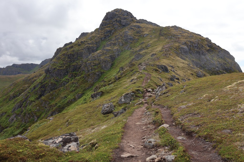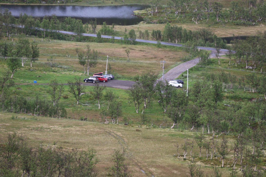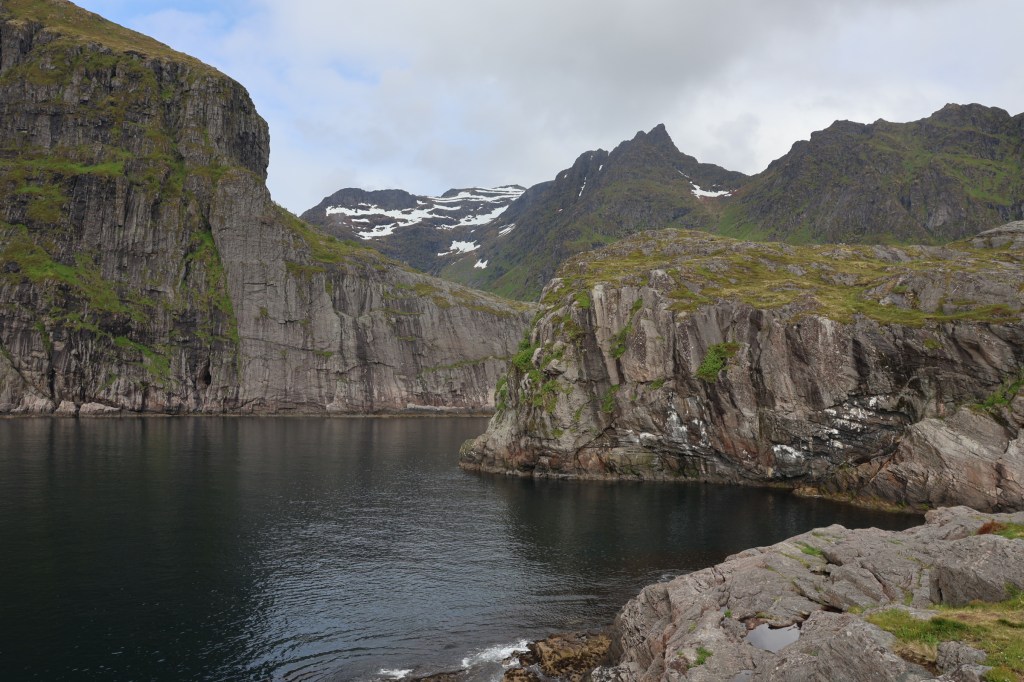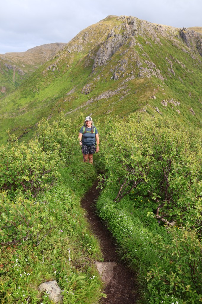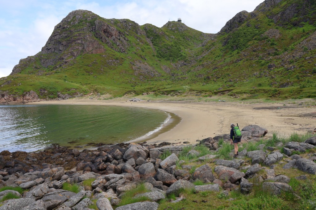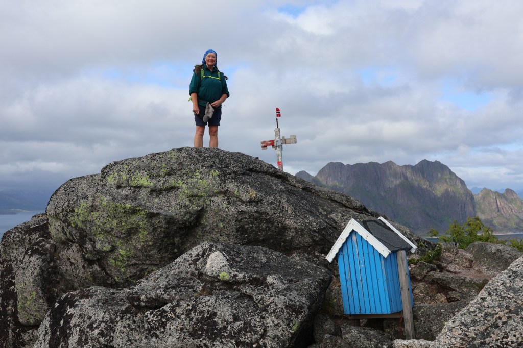 We headed for the town of Harstad then out to the end of the hill road at Elgsnes. At the high point of the road a car park offered an informal off-road overnight spot and an amazing evening walk to the peaks of Keipen, above great cliffs.