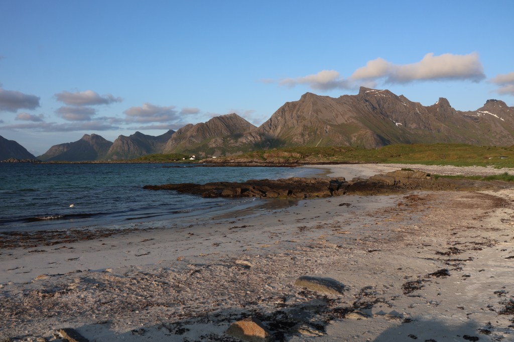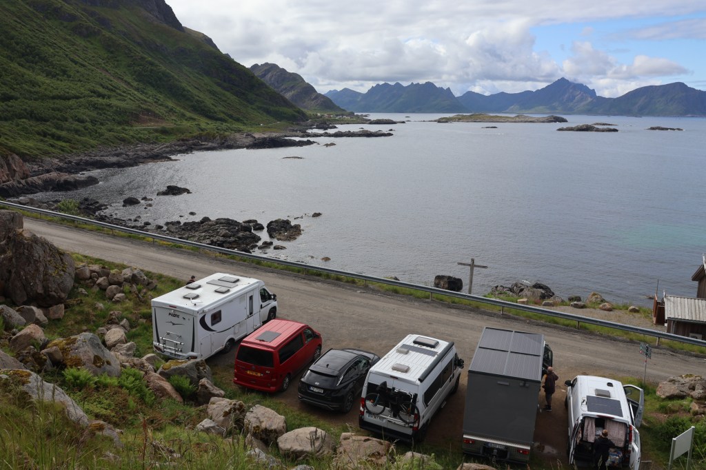We crossed to Lofoten from Bodo to Moskenes and headed for a campsite near a beach. Many motorhome users seem to prefer roadside overnighting. Why this should be so when there are campsites like this is not clear to us.