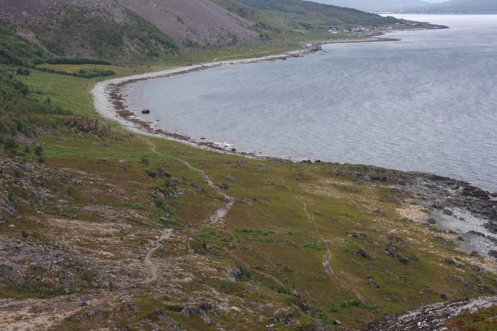 The facing slope of the much higher Storfjellet answered our earlier question. Reindeer! Thousands of them. The (mostly Sami) reindeer herders were out marking the calves, an enormous operation which takes weeks to get round them all, when neighbourly cooperation is essential.