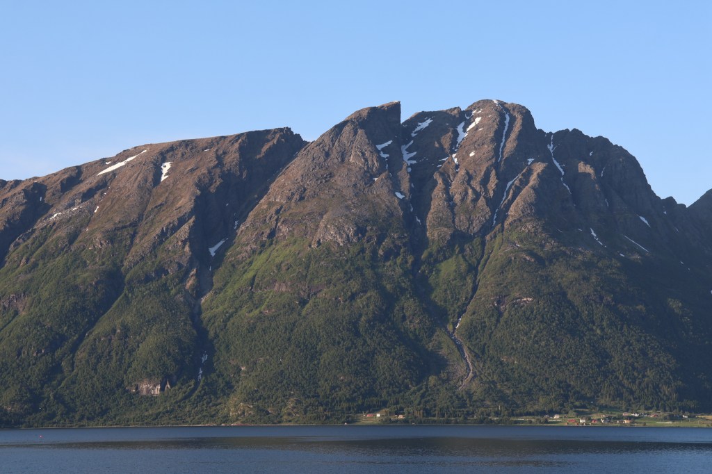 On Andørja there is agroup of steep sided mountains ranged around an inland valley with a glacial lake partly filled by daily tides, called Straumbotn. After admiring the old bridges by the outflow at Straumen (the stream), we drove up to the head of the lake.