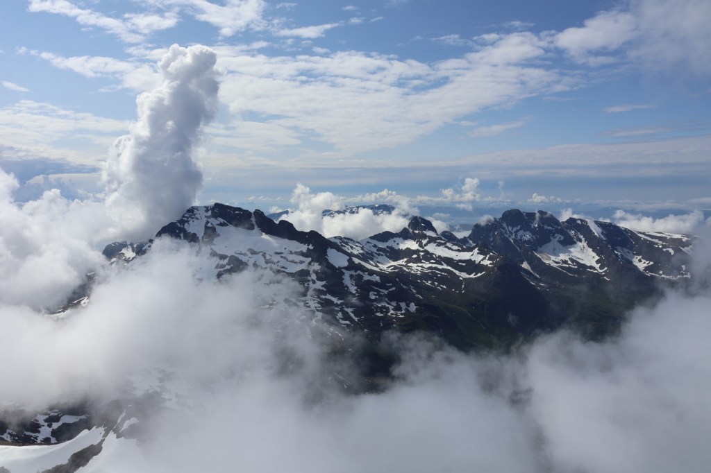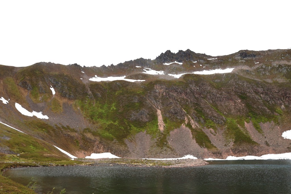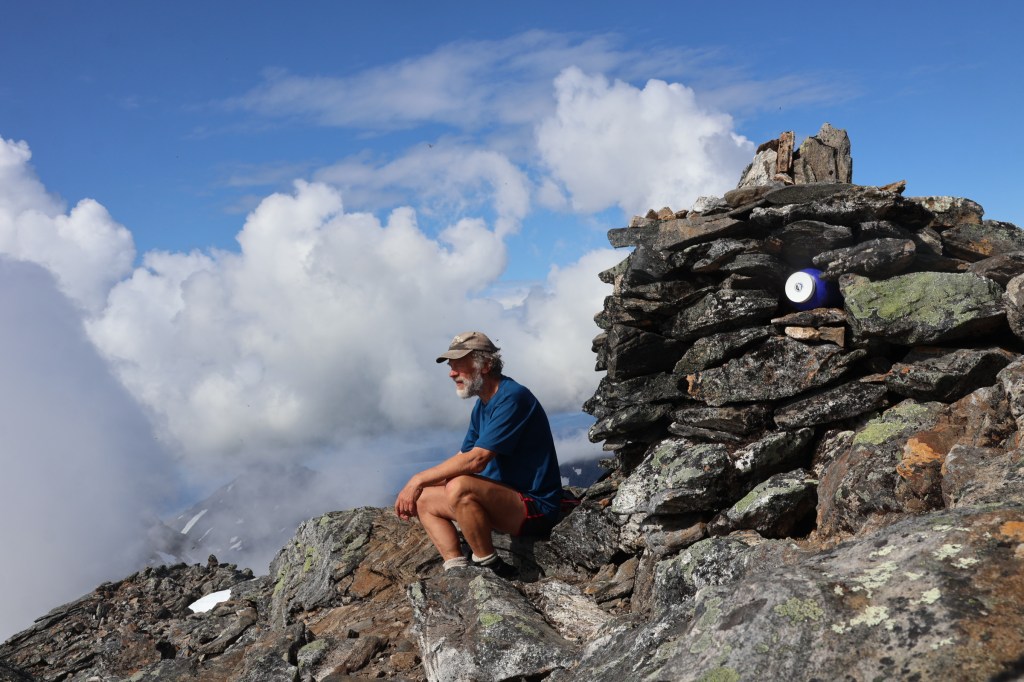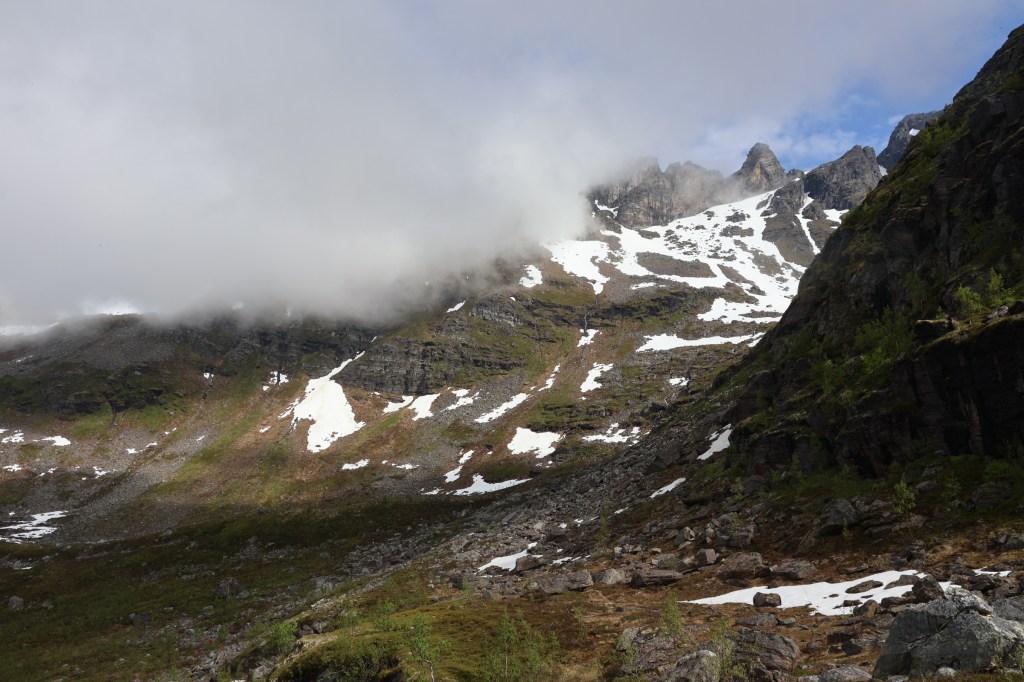From where our routes diverged, Judith crossed steep wooded and rocky slopes to Juliusvatnet. Nic’s route took him up into snowfields by a lake and clouds above. Above that…
