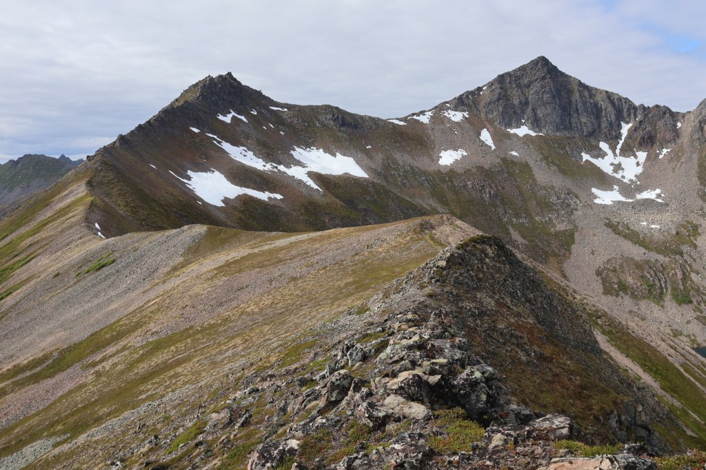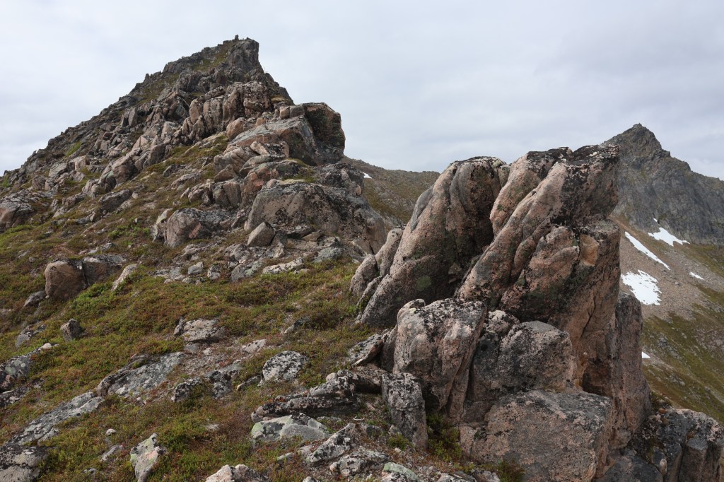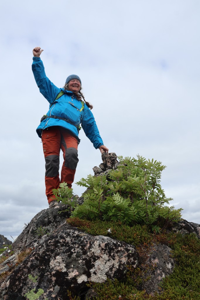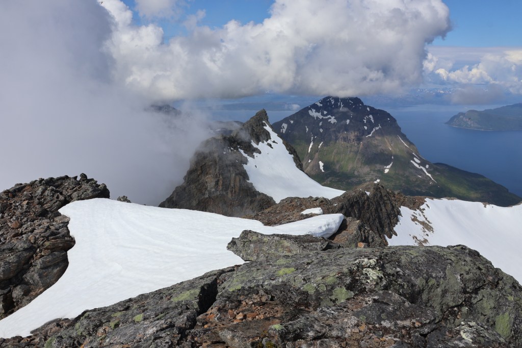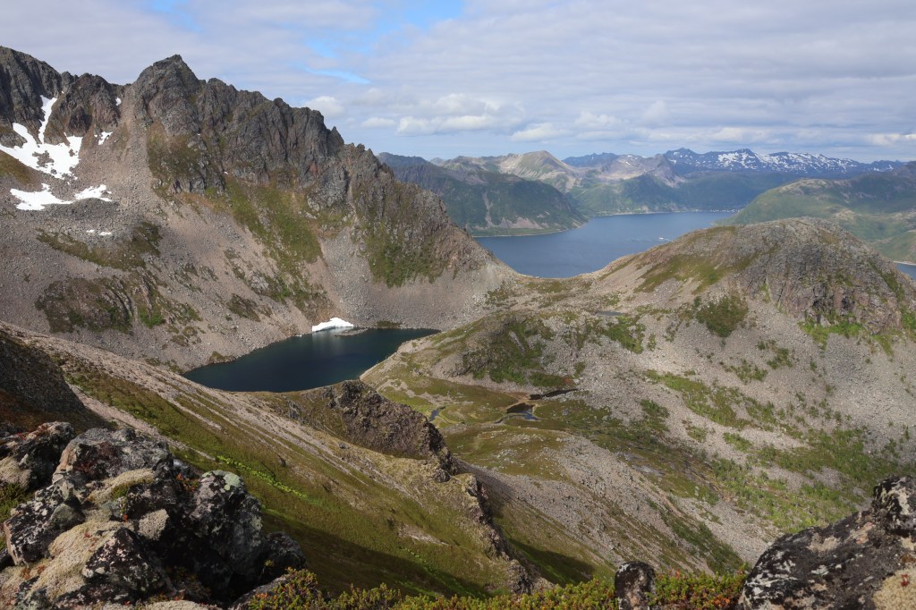 We travelled over by Kaperdalen to Gjeska and Flakstadvag, on the west coast of Senja where the mountains appear improbably wild. From a layby on the road down to Flakstadvag, we found a waymarked trail to Norddalsvatnet (a lake). The neighbouring mountain of Husfjellet seemed a good prospect for a climb. Then there was a ridge running west to Aksjelstinden, but it appeared to run into rocky pinnacles. Was it feasible? Nothing on the internet suggested it was. There is no guidebook. So with no fore-knowledge or advice, we threaded our way anong the ridge and found hardly any path, and several places where we scrambled alongside the ridge, but we made it! We were euphoric.
