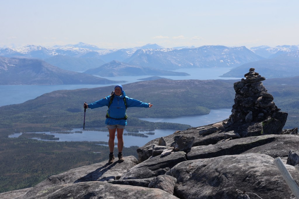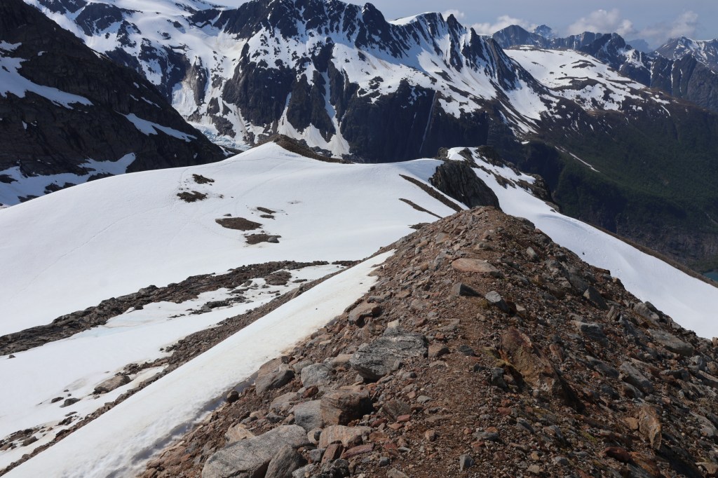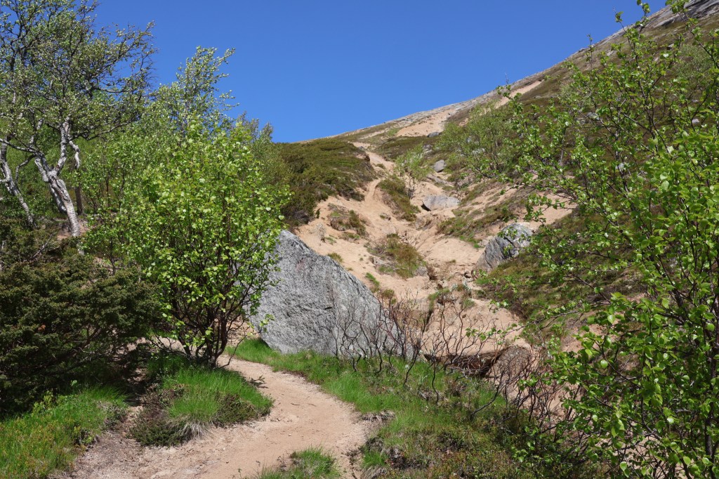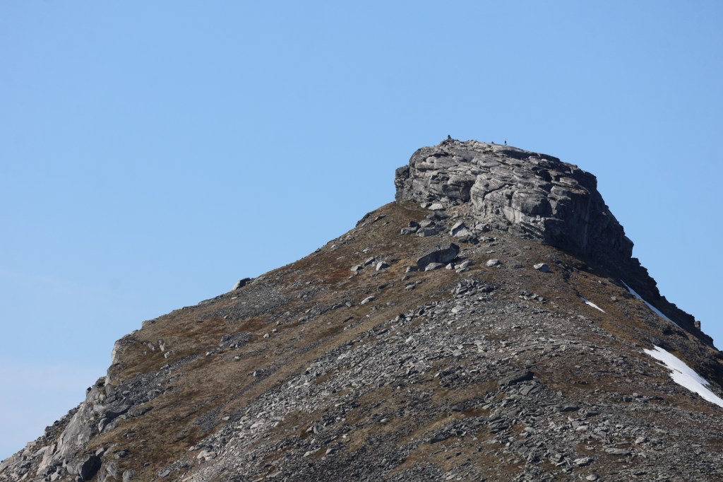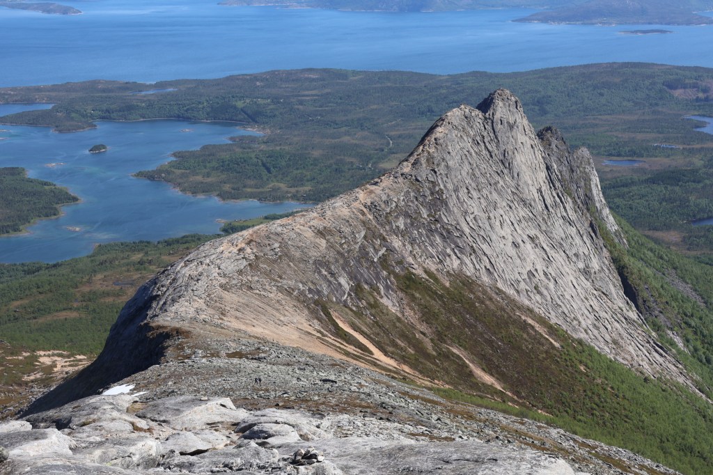The path was very steep through the woods and emerged on a sandy slope to the summit ridge. After some more normal boulderfield we came to the hat, which was steep rock. Someone had provided a surprise which allowed us to access the summit. We also made a very enjoyable traverse to the lower peak on a blunt knife edge ridge. Norway’s national mountain, Stetind, was well visible from here. Hatten was a popular peak.