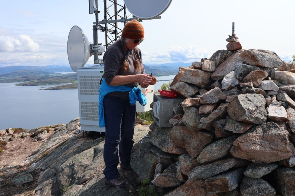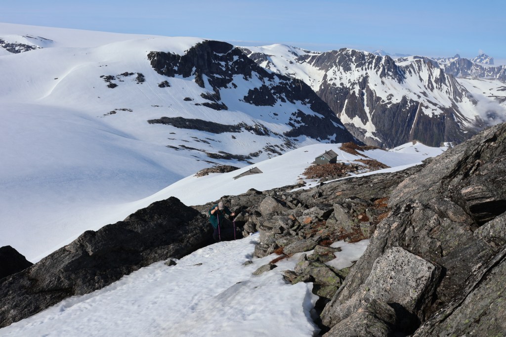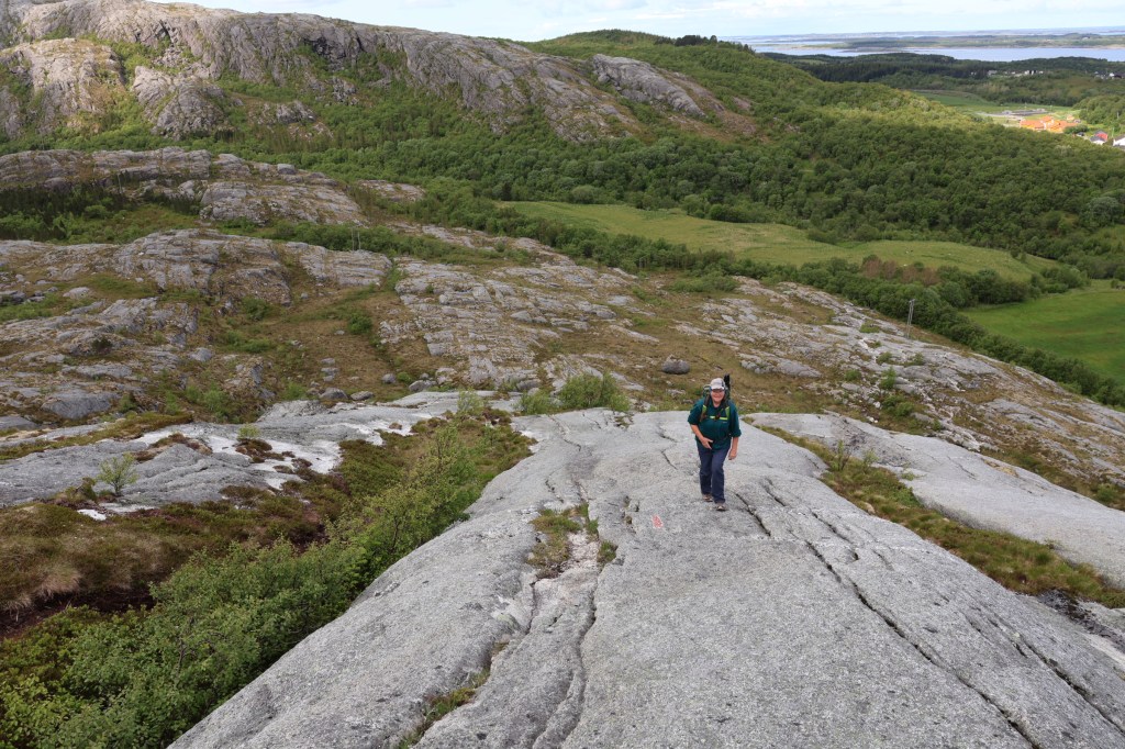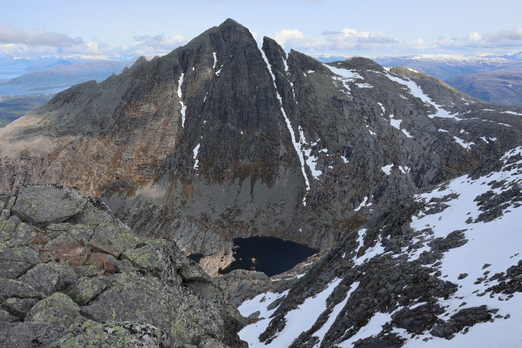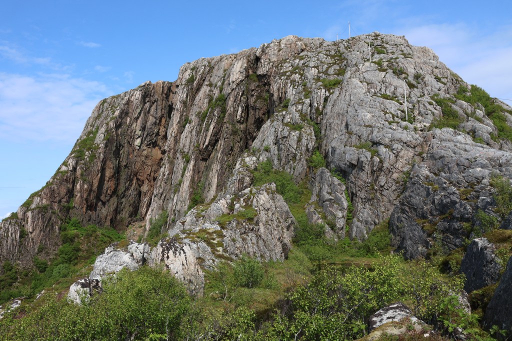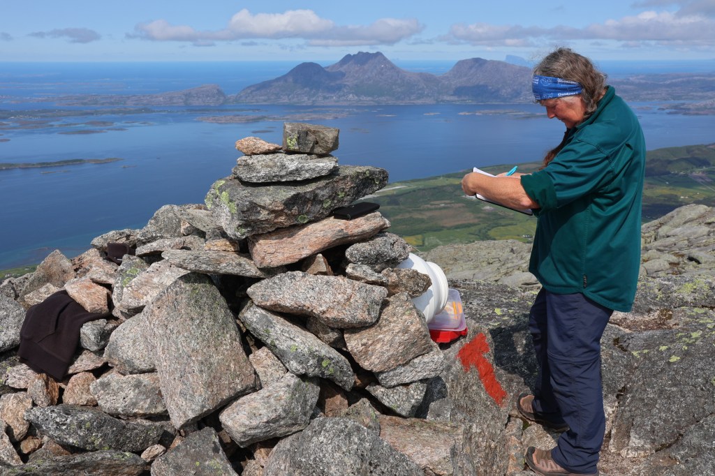 The path was very steep through the woods and emerged on a sandy slope to the summit ridge. After some more normal boulderfield we came to the hat, which was steep rock. Someone had provided a surprise which allowed us to access the summit. We also made a very enjoyable traverse to the lower peak on a blunt knife edge ridge. Norway’s national mountain, Stetind, was well visible from here. Hatten was a popular peak.