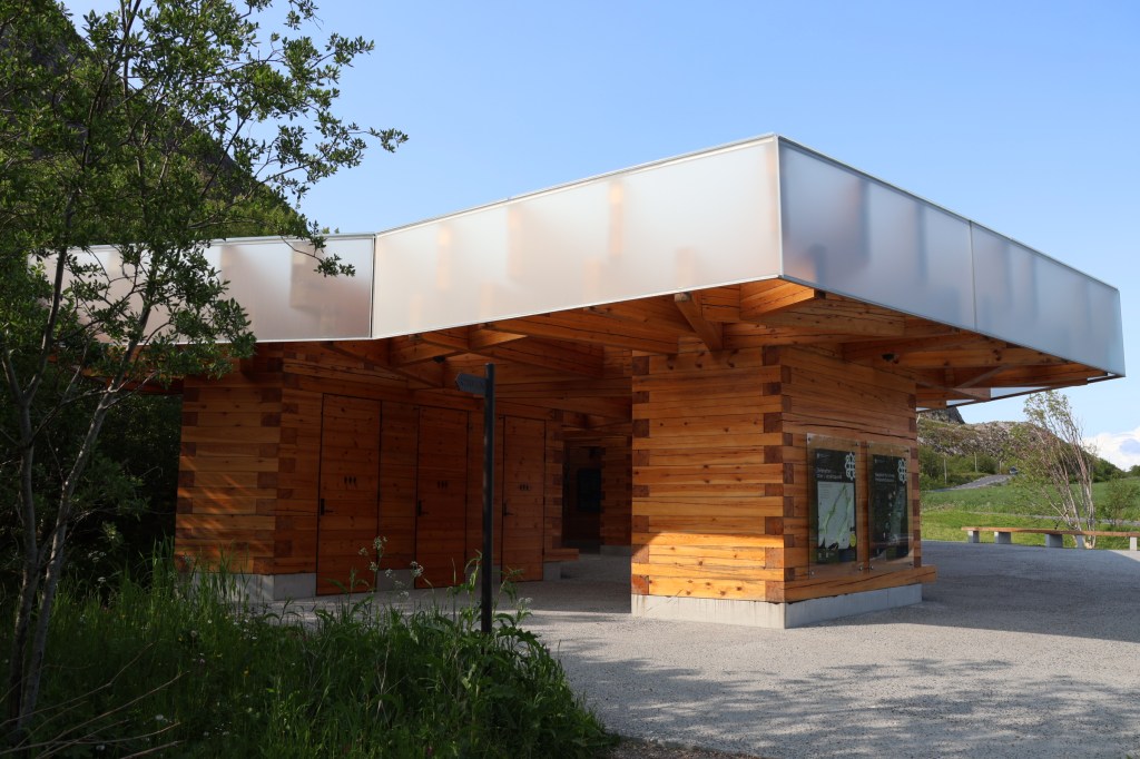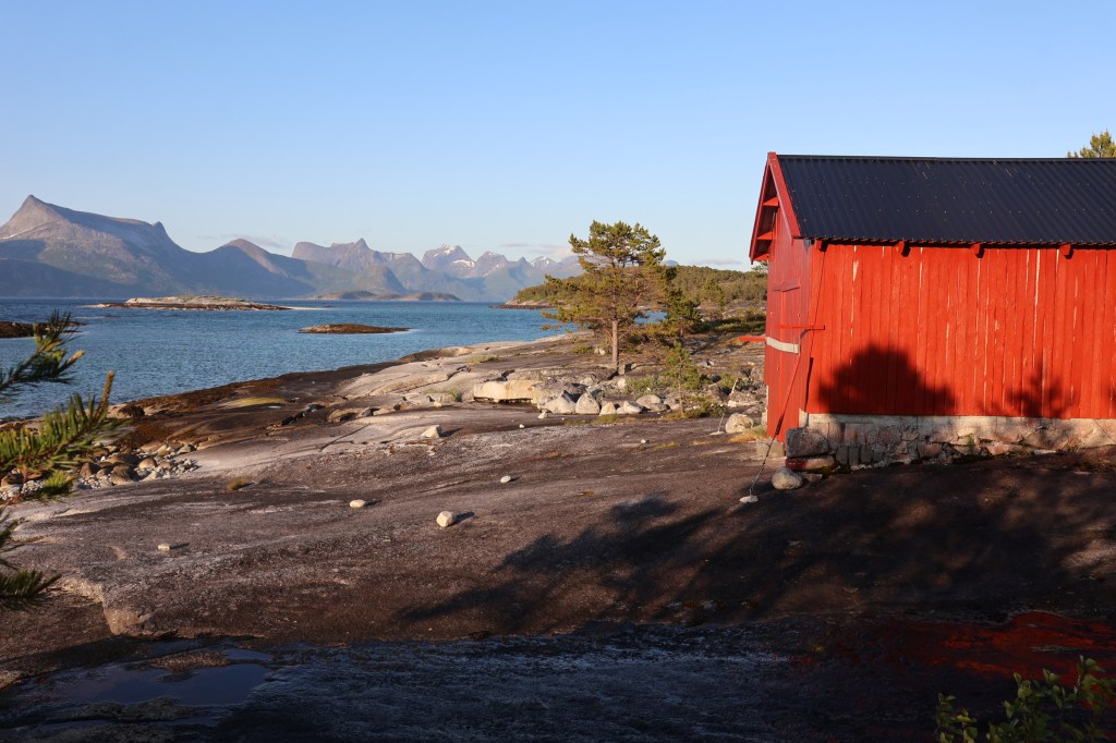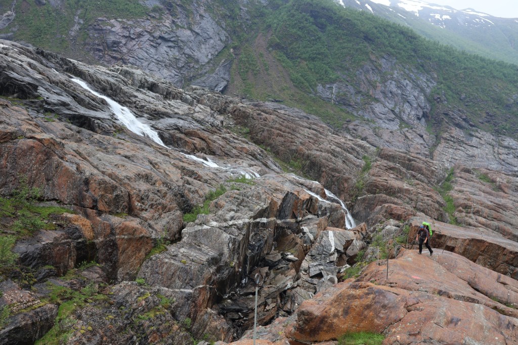 Another ferry and coastal strip but the route changes nature, becoming far more crowded by mountains. First viewpoint over Sjonafjord let us see the amazing slope opposite which appeared to be composed solely of rock slabs. When we got round that side we had a walk up to a tiny hut called Torten Kota, finishing with a paddle across a river to get to it.