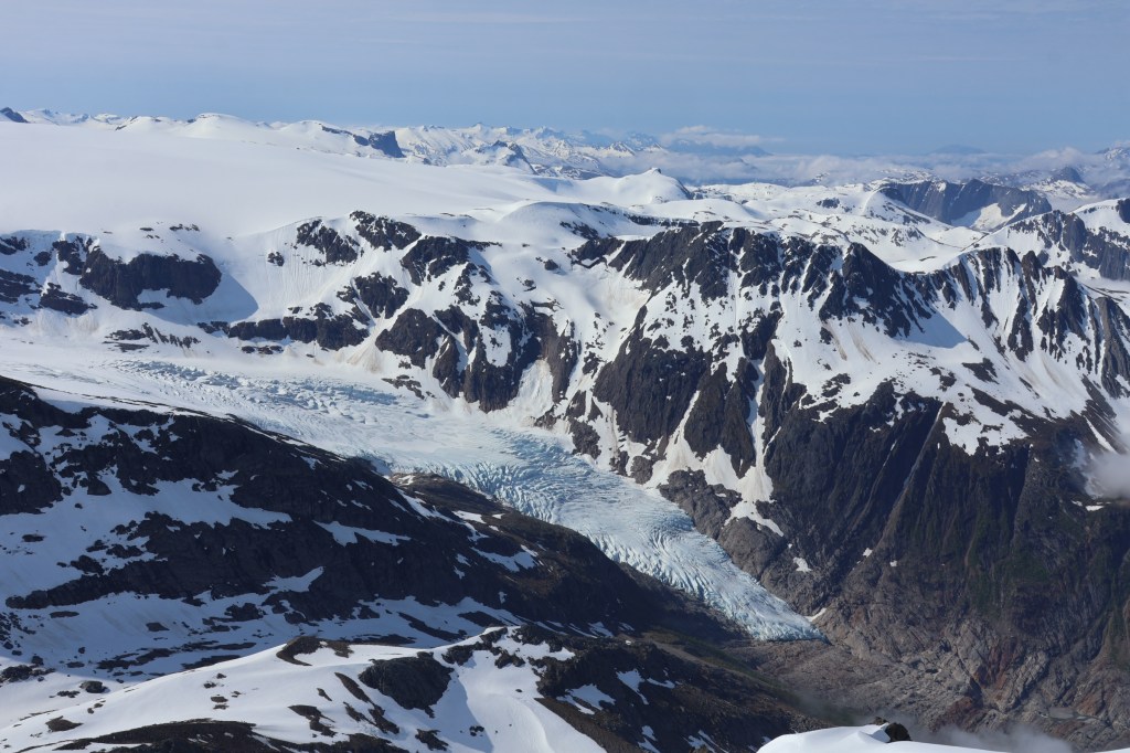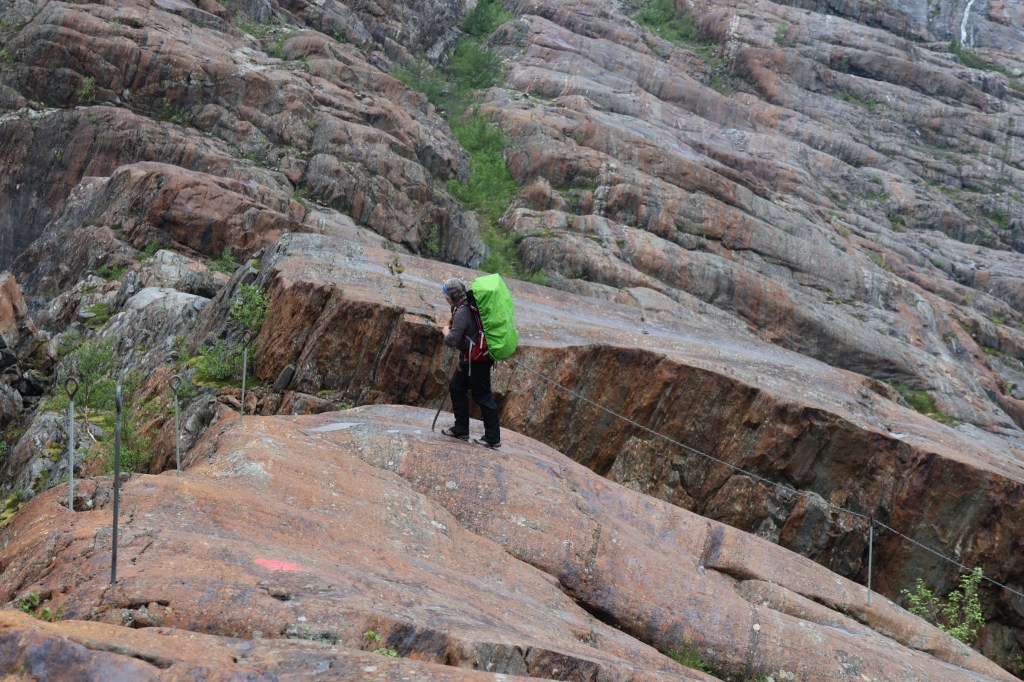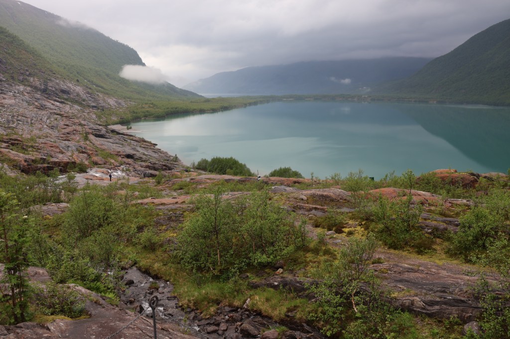 Our next plan was to use the DNT hut at Tåkeheimen. I had joined DNT and booked for the nights of 16th and 17th, but the weather looked foul for those days and fair for 15th, so, risking it, we decided to go up to it two days early. Getting there starts with a ferry across Holandsfjorden. A section of flat farm road leads to a lake in full view of the Engabreen glacier. Trails lead up to the slabs below the glacier, and then our steep approach to Tåkeheimen started.
