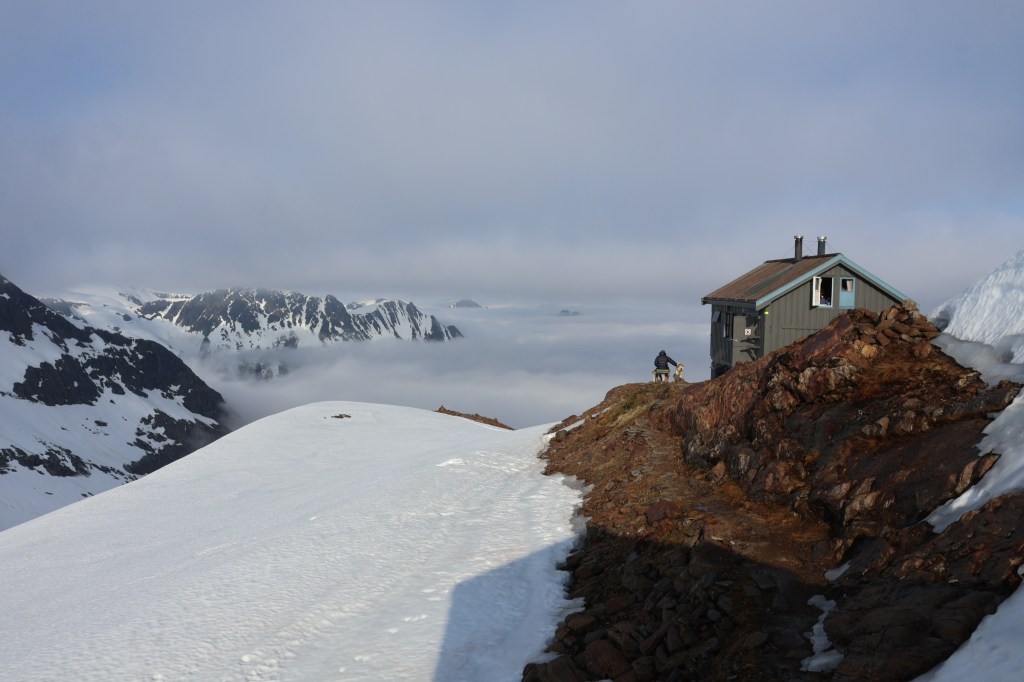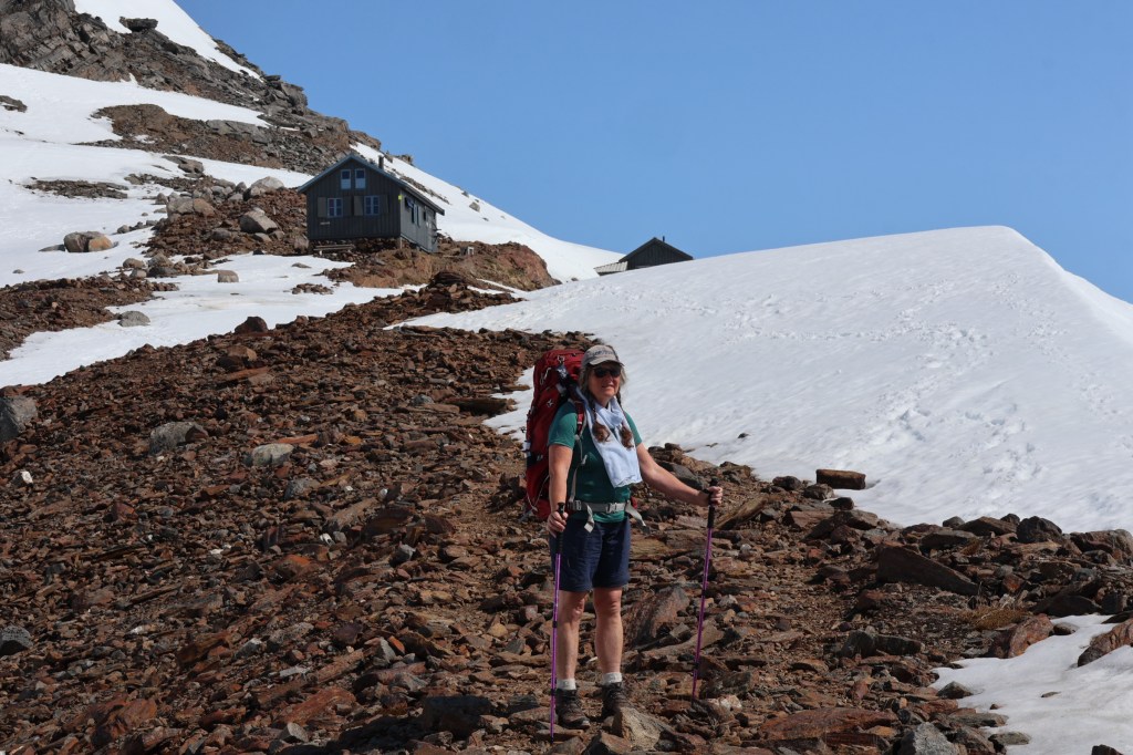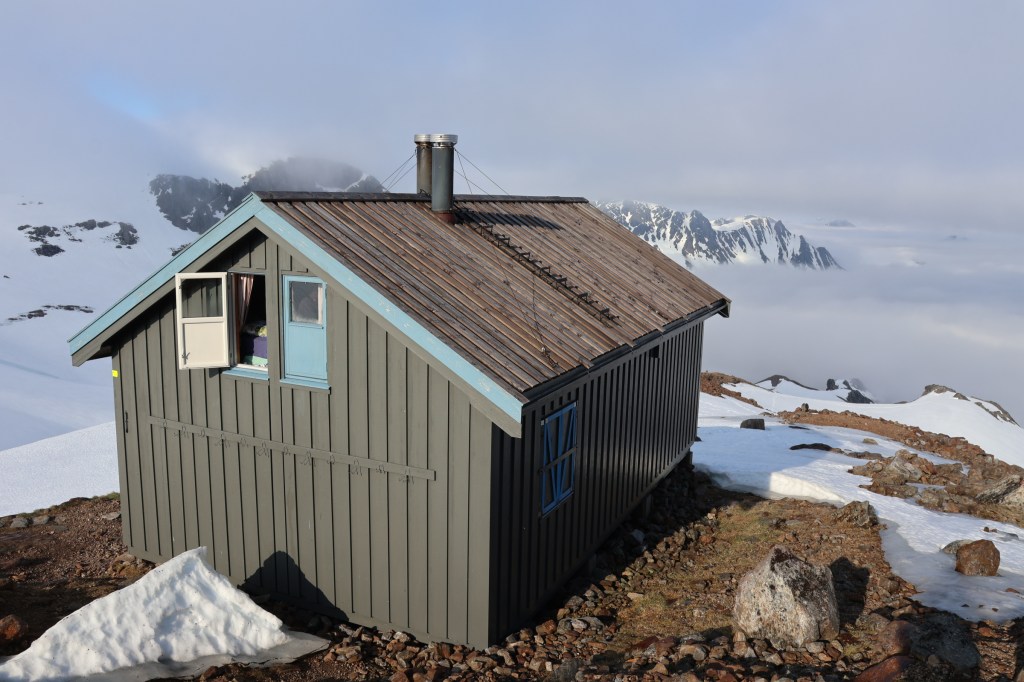 We climbed into cloud about 900metres, just as we met large snow patches obliterating the path and the guide marks. There was a difficult section when I commented that I had rarely felt so dependent on finding the correct route in whiteout with no prior knowledge or landmarks. Some of the snow was very icy. We used crampons and ice axes. We headed North East, which felt right and was encouraged by our information on mobile phone, and started to find cairns and marks again. The hut loomed out of the mist about 30m away.