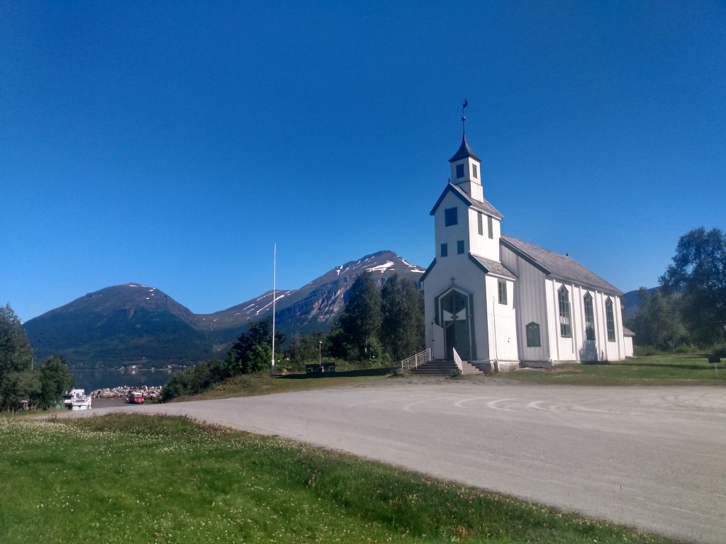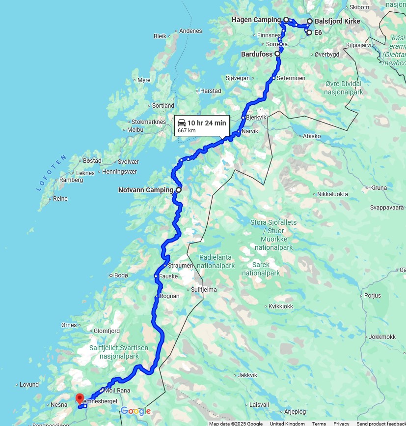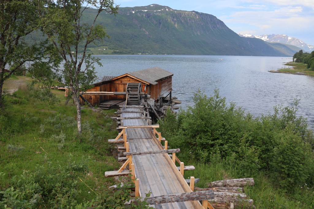 Balsfjord peninsula was a great find. Rock art at Tennes and an old church; one of the most welcoming campsites at Berg; water-powered sawmills at Aursfjord and then we travelled the E6 via Notvann and a couple of visitor centres to a peninsula near Mo i Rana.