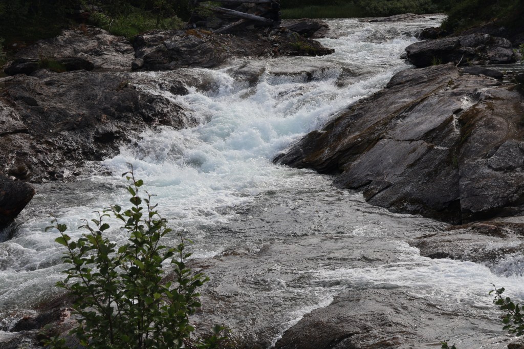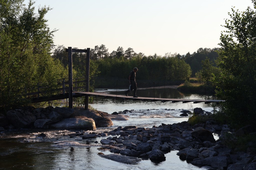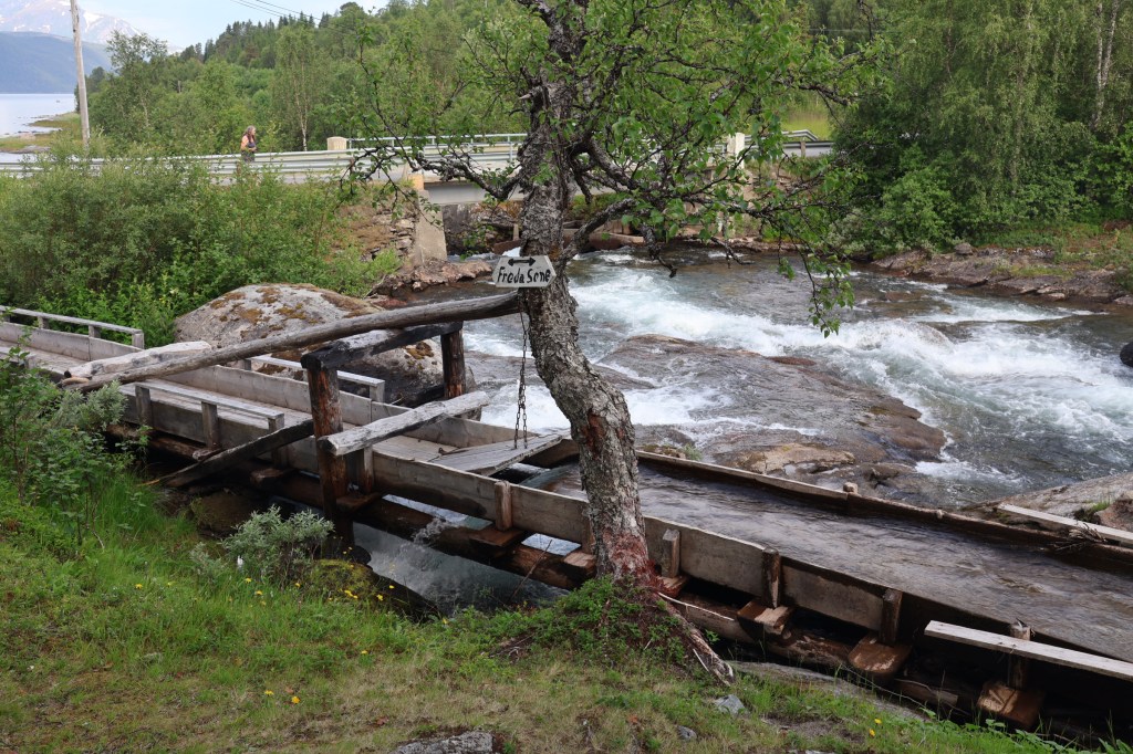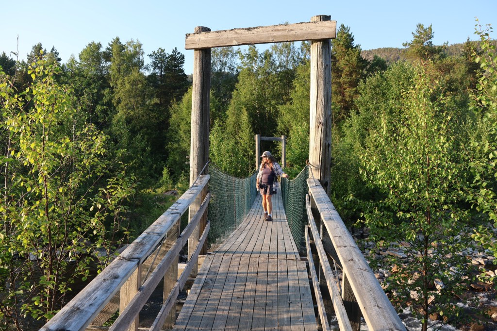By coincidence, at the campsite near the E6 where we pulled off that evening was another vass-saga, accessed over a suspension bridge, a henge-bru (hanging bridge).