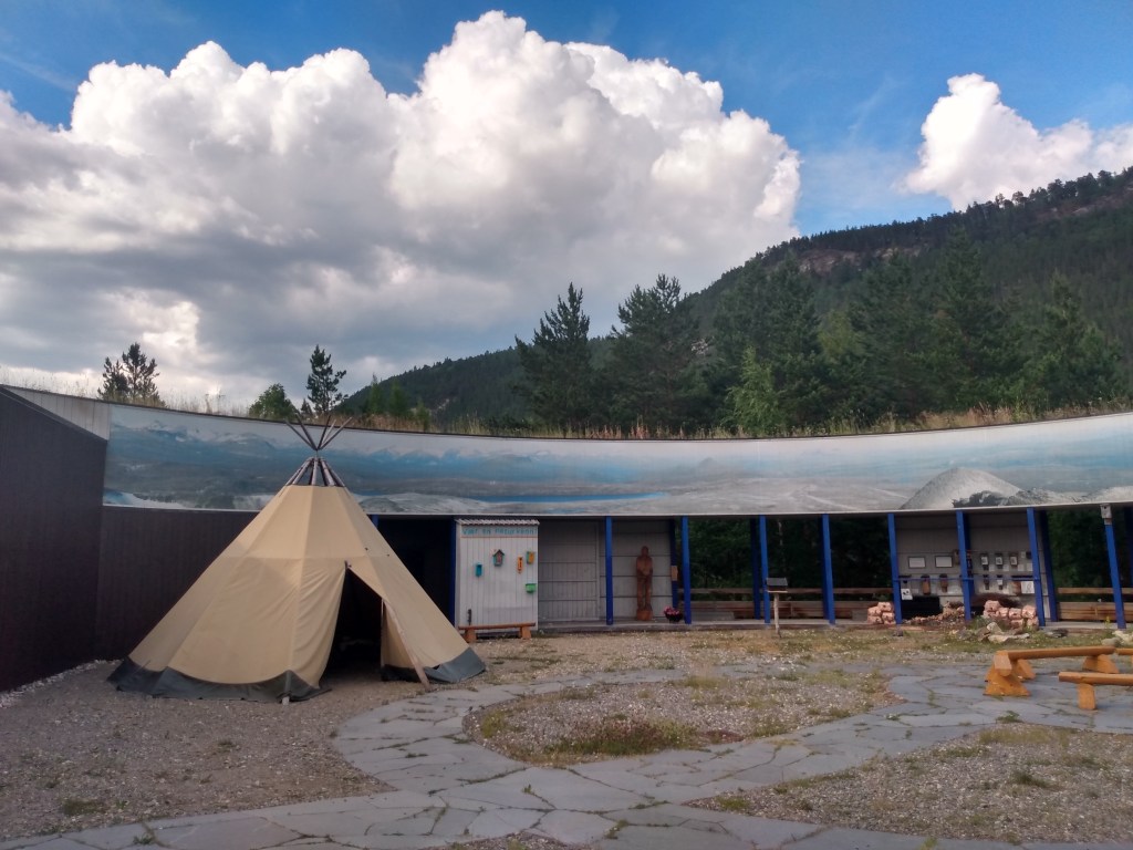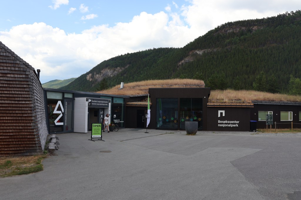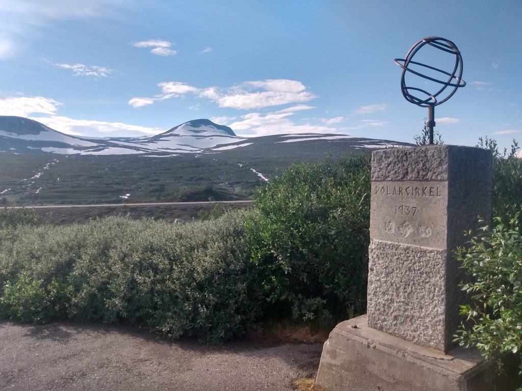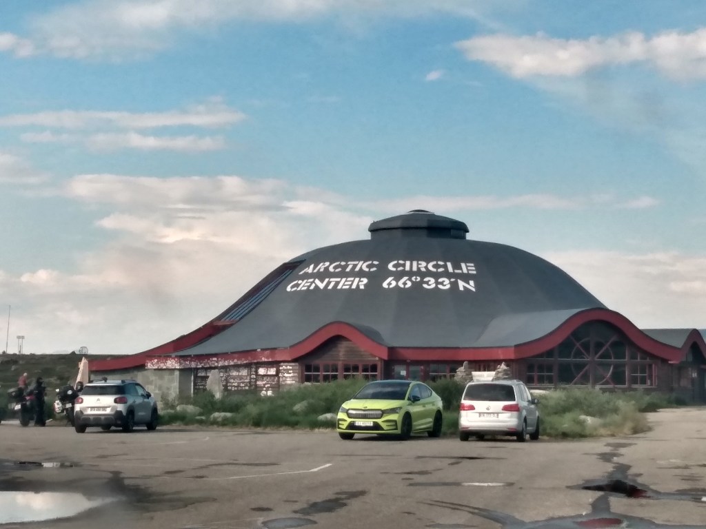 A long drive next day, with lots of interest. The E6 is much more direct than our route north, having only one ferry, and following long dales between occasional coastal sections. Two visitor centres gave us cause to stop: A Centre for the five National Parks in this part of Nordland, and the much more commercial Polarkirclen Centre almost on the Arctic Circle.