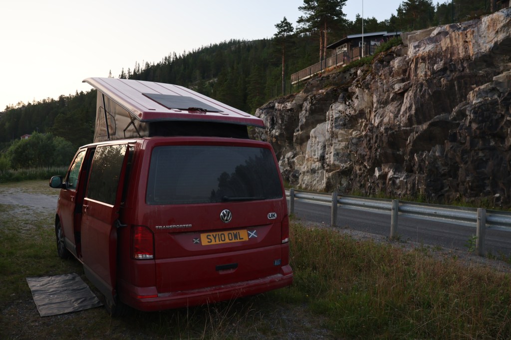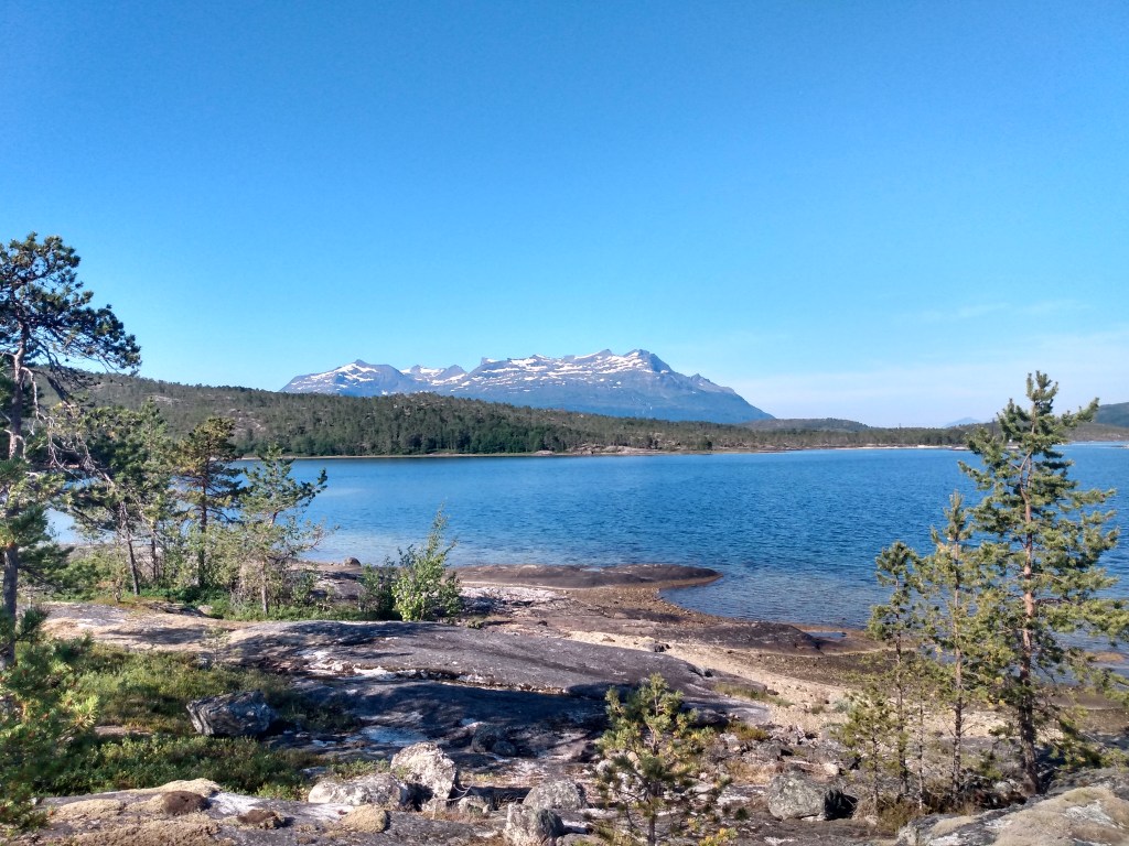 The E6 took us past Mo i Rana and another peninsula for a roadside stop overnight. Unfortunately, the road had been recently planed, and the cliffs opposite reflected a lot of sound. At least traffic was light until 6am.The best thing about it was easy access to the sea for a cool-off in the water.