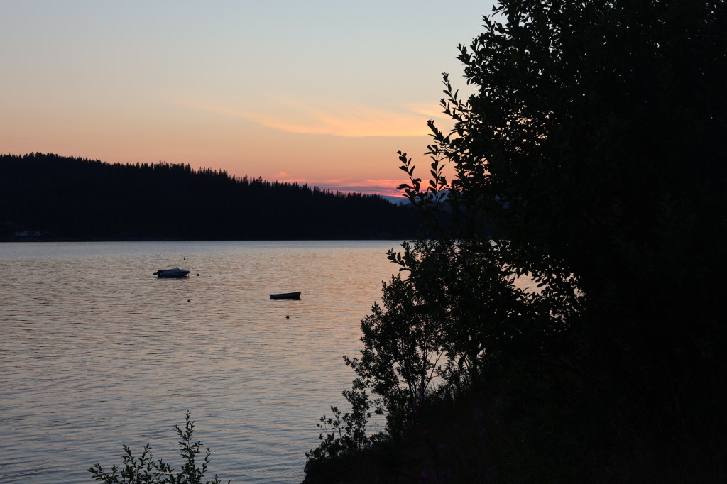The bay was called Sagpollen. It was warm. We were surprised to find such a quiet and pleasant campsite, called Notvann, next to the main road in the height of the season. Generally campsites tried to provide lots of facilities, activities and attractions, and filled up with white boxes, some of which stayed for weeks.